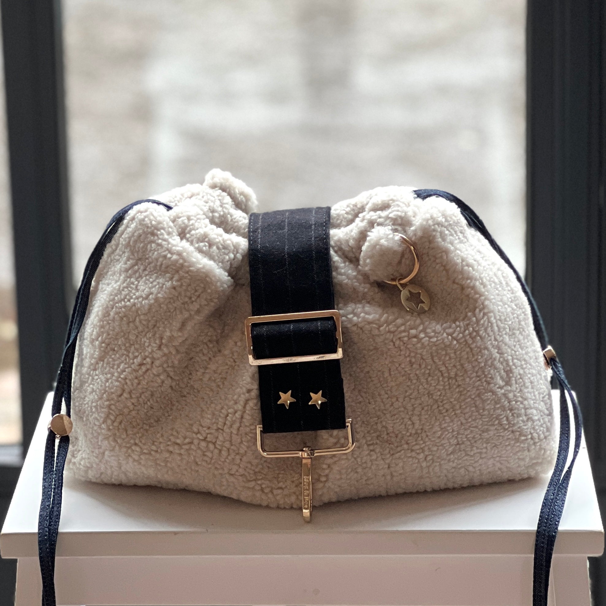 Handmade for Meg & Bee in London. Each Bubble Bag comes with its own removable strap as shown in first image. Gold star disc attached, the sign of a Meg & Bee bag.