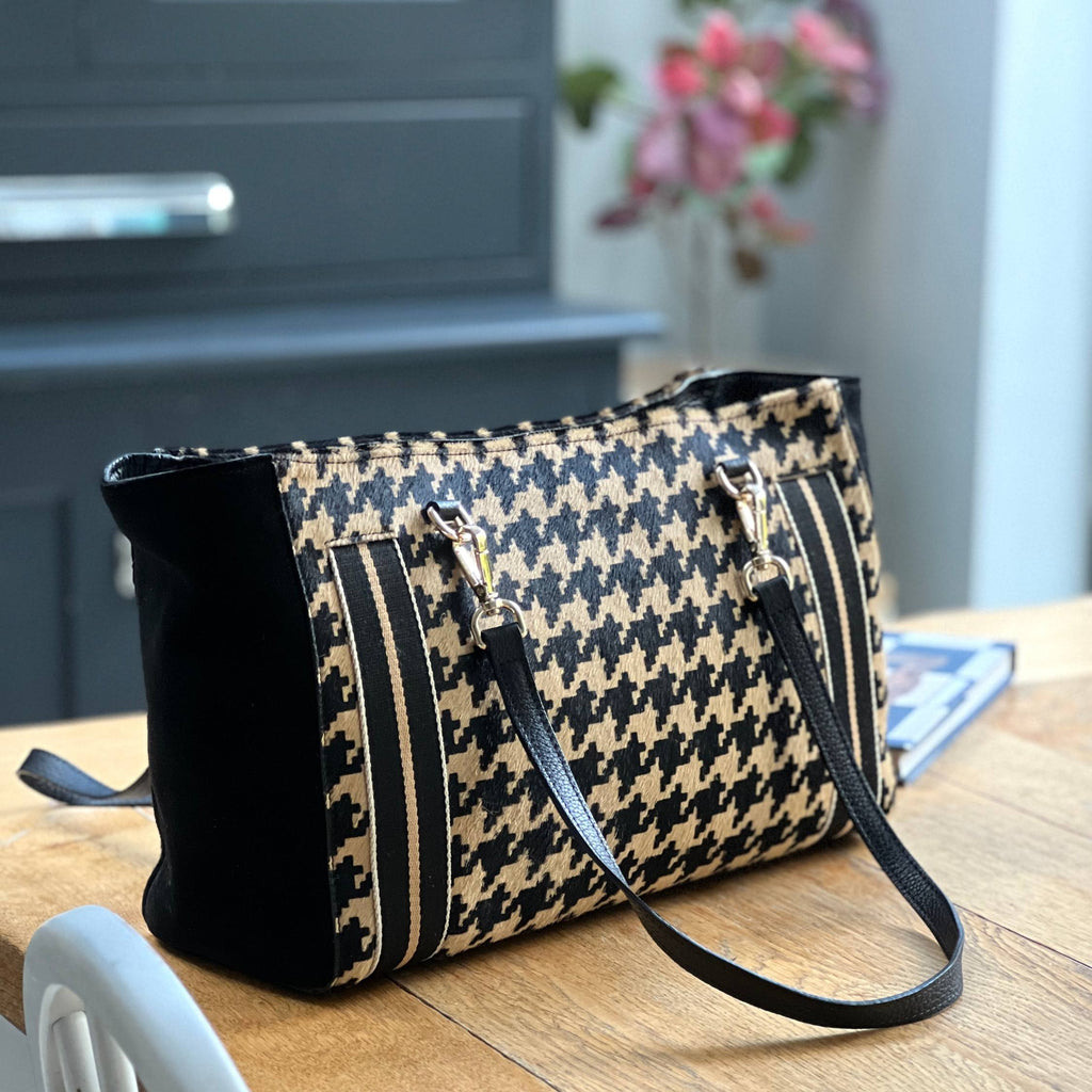 Printed cowhide in dogtooth design; tan & black with our Bath webbing stripes on both sides. Black suede on ends. Black pebble grain leather on base and straps.