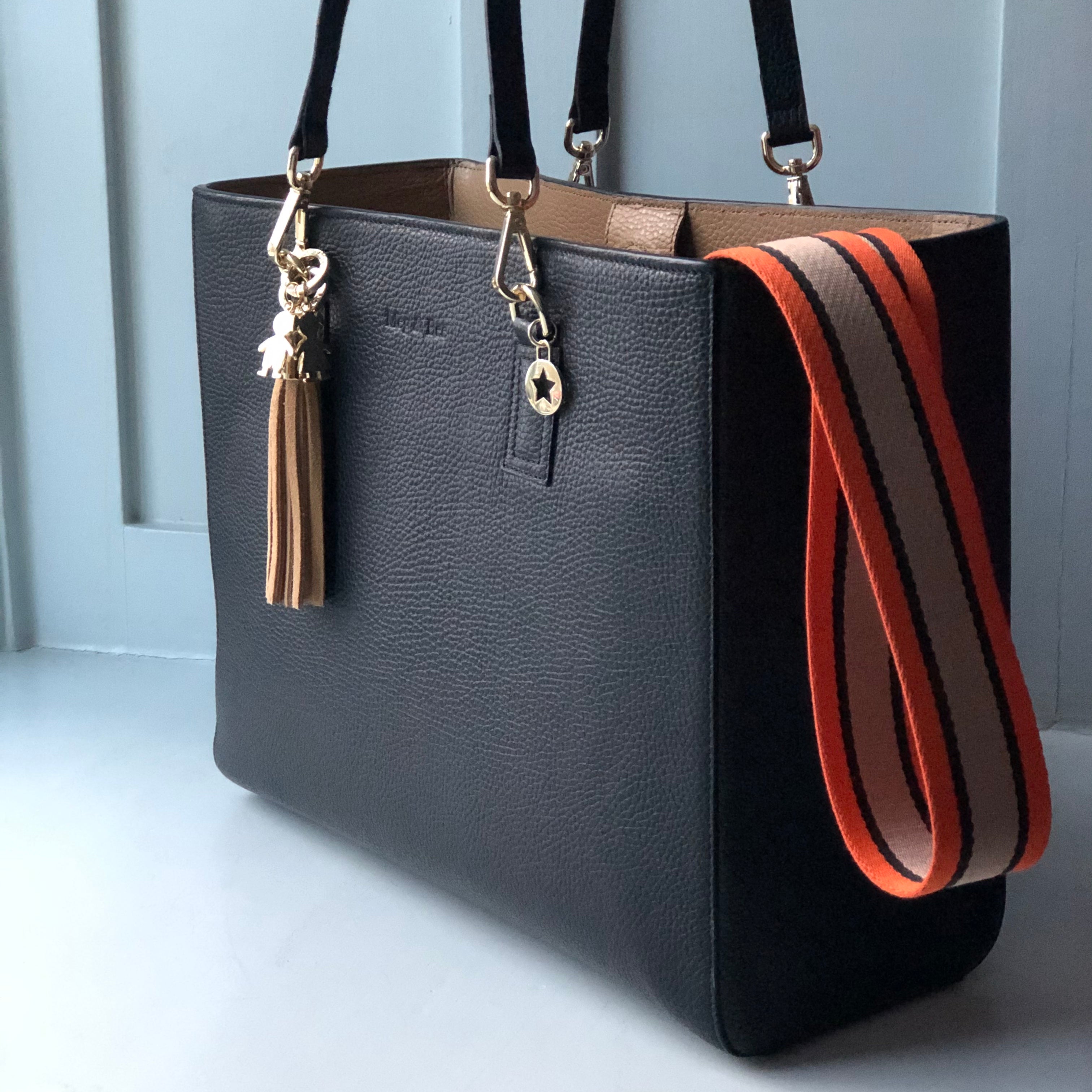 Designed in London by us and hand-crafted in our small workshop in Spain. The Slouchy Tote is large enough to carry all those essential items as well as a laptop, large diary and A4 notebook. Each bag comes with a pair of its own removable leather handles in the same colour pebble grain as the outside. These can be used either as carry straps or shoulder straps. It has four leather pads on the base to give it more protection. Single internal zipped compartment. Other components can be bought separately; make it your own by choosing a combination of tassels,and charms.